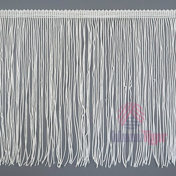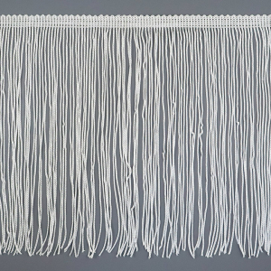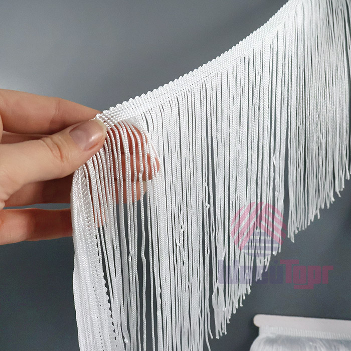 Длина ниспадающих нитей составляет 20 см, а ширина пришивного элемента (тесьмы) — 1 см.