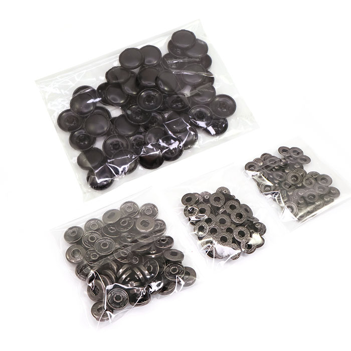 Металлические установочные кнопки системы "Альфа", состоящие из 4 частей. Установка кнопок на одежду производится с помощью пресса и специальных насадок.