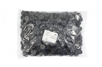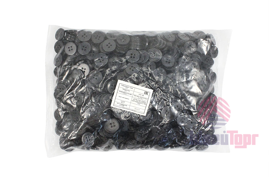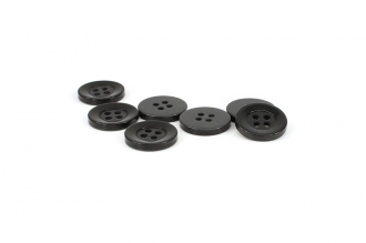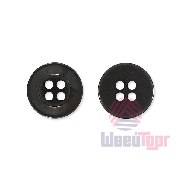 Пластиковые брючные пуговицы на четыре прокола. Лицевую сторону пуговиц окаймляет плоское кольцо шириной 3 мм и небольшое углубление, что придаёт им особый характер. У пуговиц тёмно-серый цвет, с лёгким мерцанием, что придаёт им ещё более привлекательный вид.