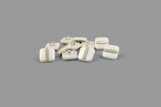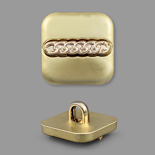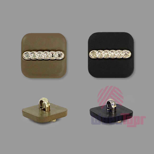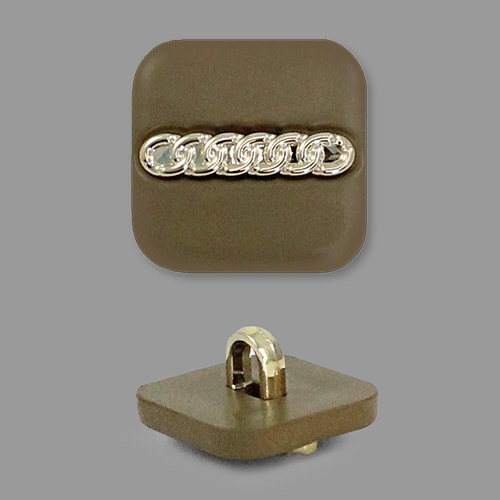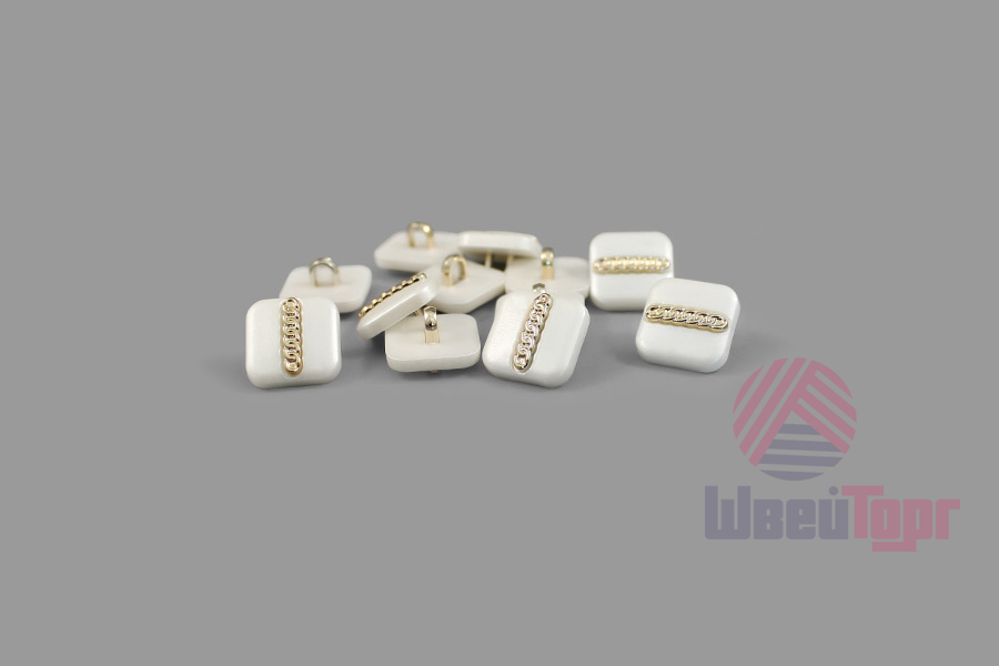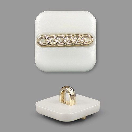 Пуговица имеет привлекательный дизайн – матовая однотонная основа, которую украшает объёмный элемент в центральной части в виде цепи. Оригинальный элемент для яркого образа. Пуговица представлена в четырёх цветах: молоко, чёрный, коричневый золото.