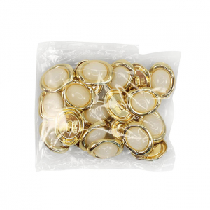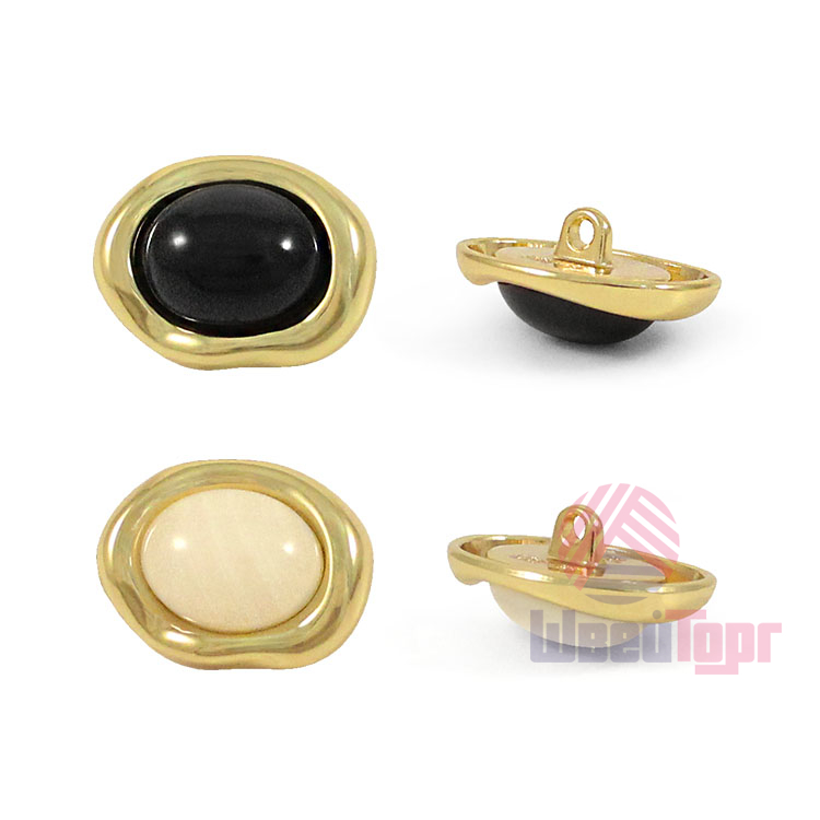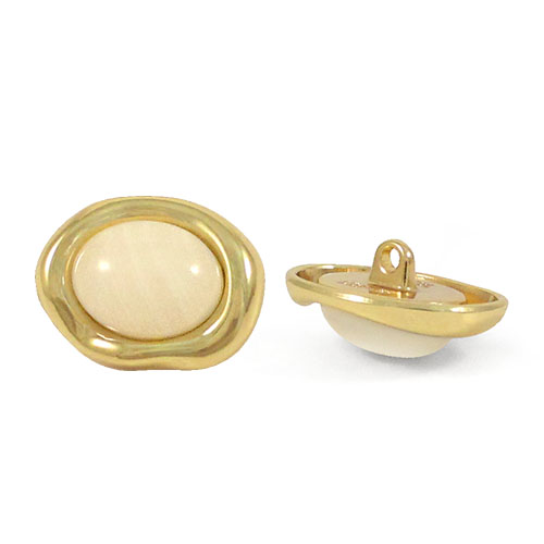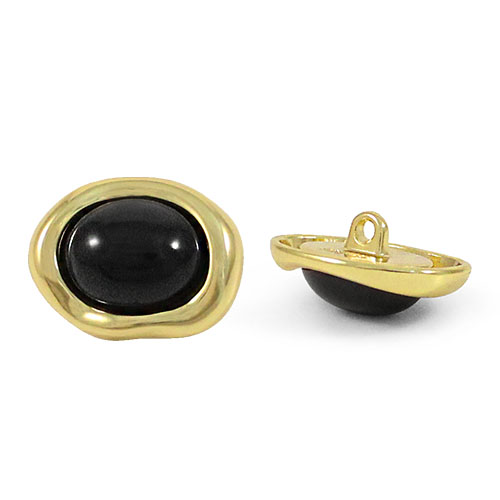 Эта пуговица напоминает миниатюрное произведение искусства. Её основа – стильный асимметричный овал, в центре которого, словно драгоценный камень, сияет выпуклая глянцевая вставка. Обрамленная золотистой «рамкой», она притягивает взгляд своей безупречной чистотой линий и лаконичностью.