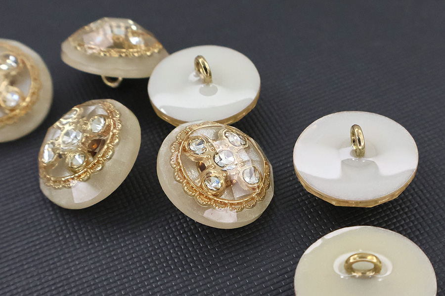 Внутри прозрачной акриловой полусферы с красивыми гранями скрывается настоящее сокровище — композиция из пяти искрящихся страз. Камни заключены в изящное обрамление: тонкое золотое кольцо с филигранным орнаментом, что придает пуговице особую драгоценную эстетику.