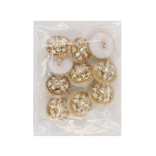 Внутри прозрачной акриловой полусферы с красивыми гранями скрывается настоящее сокровище — композиция из пяти искрящихся страз. Камни заключены в изящное обрамление: тонкое золотое кольцо с филигранным орнаментом, что придает пуговице особую драгоценную эстетику.