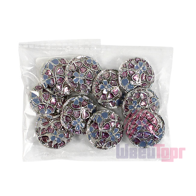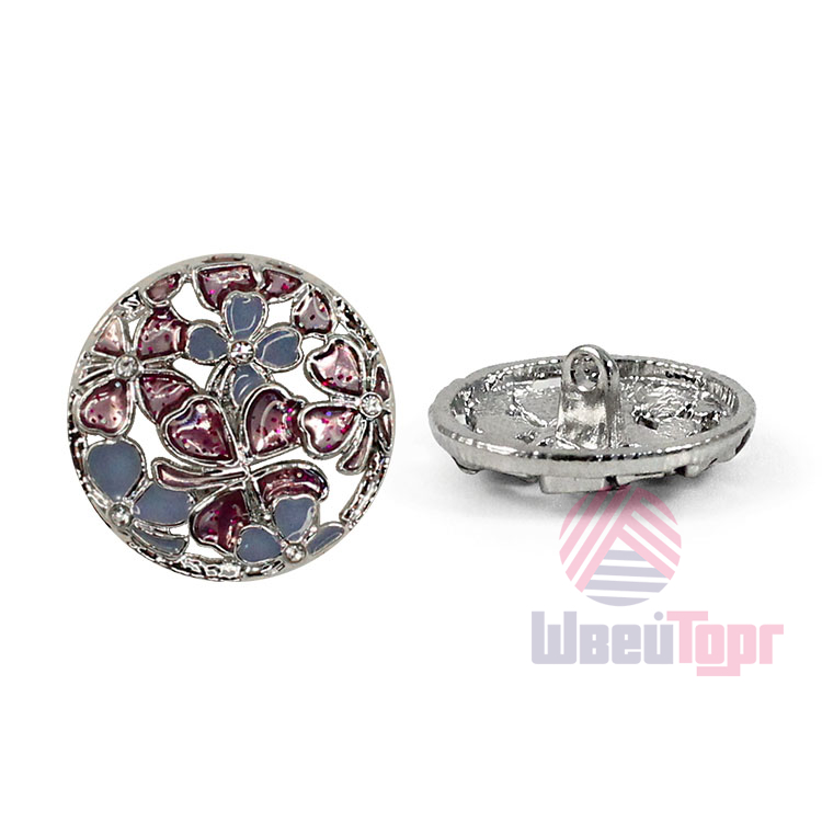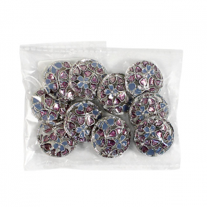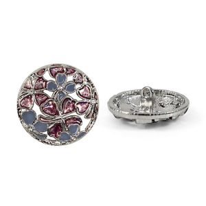 Позвольте вашему наряду расцвести! Эта металлическая пуговица напоминает драгоценную миниатюру. Её сложный, резной дизайн завораживает: основа из серебристого металла подобно кружевной ленте обрамляет нежный букет. Ажурная резьба, образующая букет из голубых и пурпурных соцветий, и лёгкое сияние блёсток делают их маленьким шедевром.
