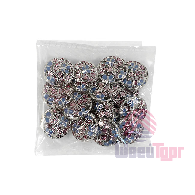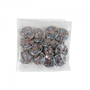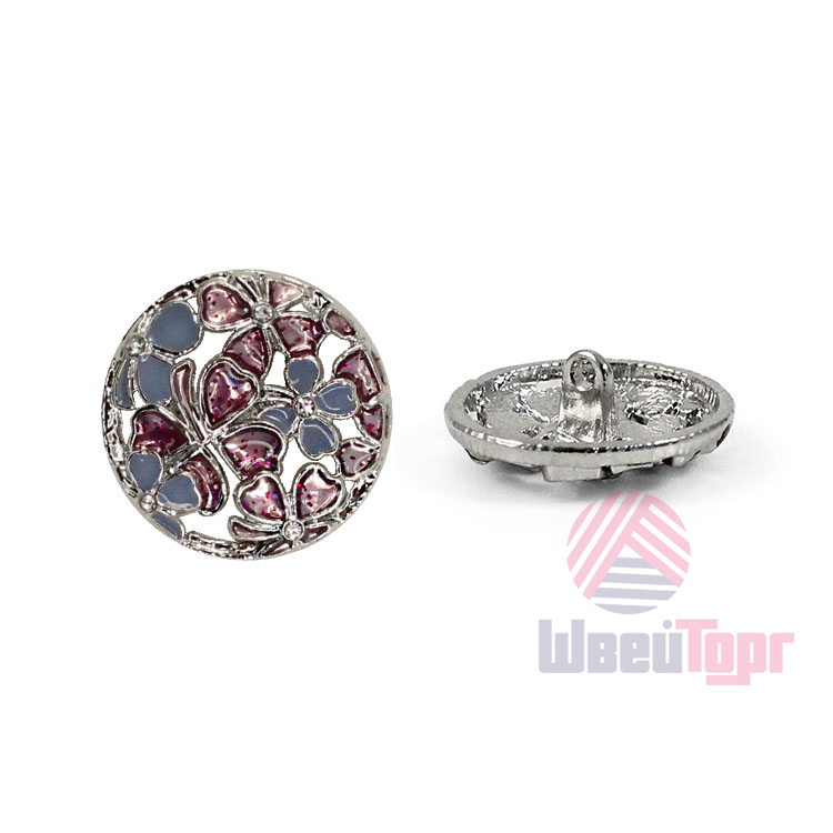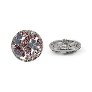 Позвольте вашему наряду расцвести! Эта металлическая пуговица напоминает драгоценную миниатюру. Её сложный, резной дизайн завораживает: основа из серебристого металла подобно кружевной ленте обрамляет нежный букет. Ажурная резьба, образующая букет из голубых и пурпурных соцветий, и лёгкое сияние блёсток делают их маленьким шедевром.