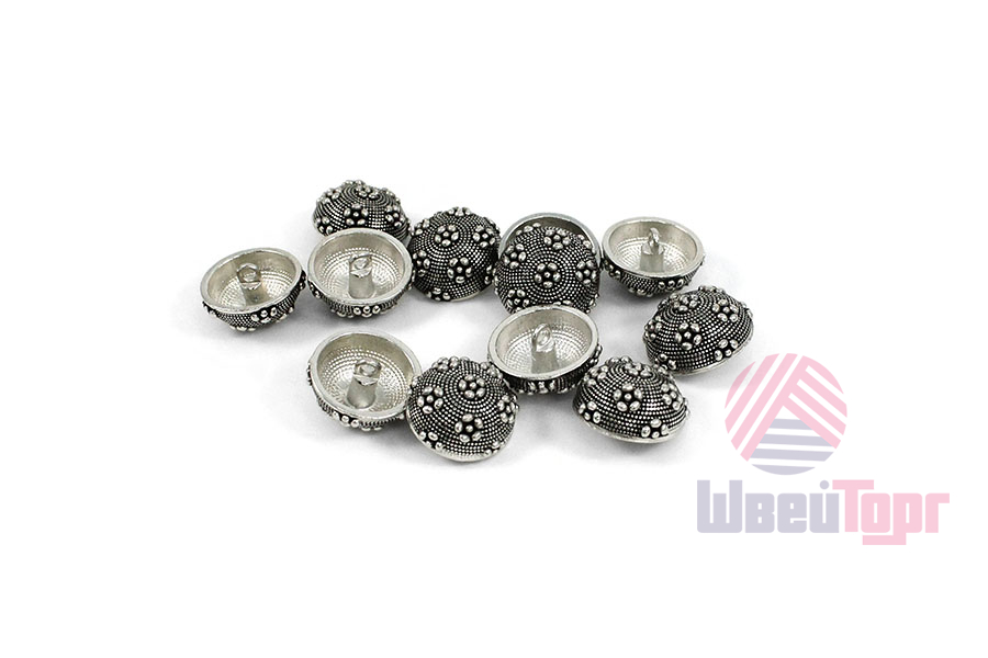 Металлическая пуговица на ножке, диаметр 18 мм, выпуклая форма. У пуговицы оригинальная форма и дизайн - фактурная поверхность, украшенная стилизованными цветками из шариков.