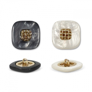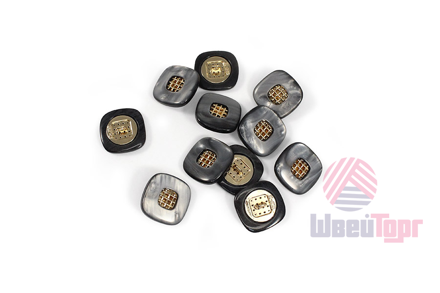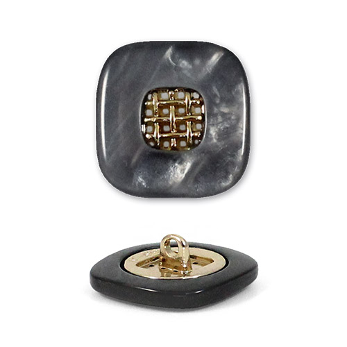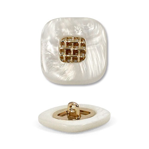 Эта пуговица из пластика с лёгким перламутровым эффектом привлечёт внимание изящной деталью: в центре квадрата, с мягко скруглёнными углами, расположена изысканная золотая решётчатая вставка.