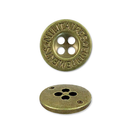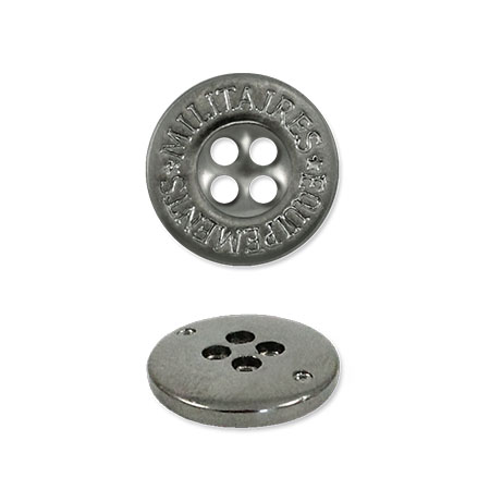 Эта пластиковая пуговица с эффектной металлической имитацией обладает лёгким весом, что делает её практичной в пришивании и комфортной в носке. Классическая круглая форма с четырьмя отверстиями и лаконичным углублением в центре дополнена контурной гравировкой «MILITAIRES EQUIPEMENTS».