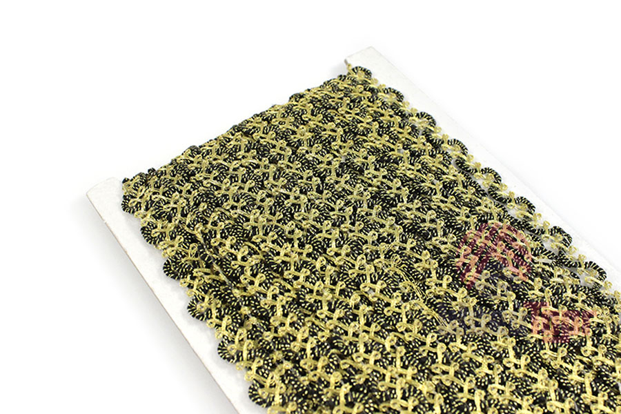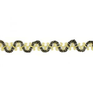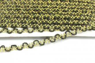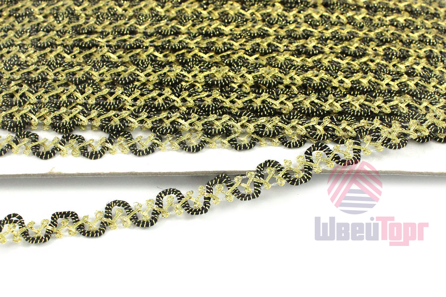 Тесьма доступна в чёрно-золотой расцветке. Она идеально подходит для отделки одежды, декора сценических костюмов, а также для украшения головных уборов и элементов интерьера. Представляет собой прочную плетёную, рельефную тесьму с повторяющимся геометрическим узором. Тесьма пронизана металлизированными нитями, что придаёт ей уникальный блеск. Создавайте свои неповторимые изделия!