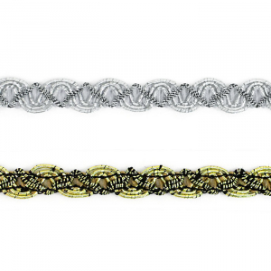 Тесьма доступна в двух цветах: золото и серебро. Она идеально подходит для отделки одежды, декора сценических костюмов, а также для украшения головных уборов и элементов интерьера. Представляет собой прочную плетёную, рельефную тесьму с повторяющимся геометрическим узором. Тесьма пронизана металлизированными нитями, что придаёт ей уникальный блеск. Создавайте свои неповторимые изделия!