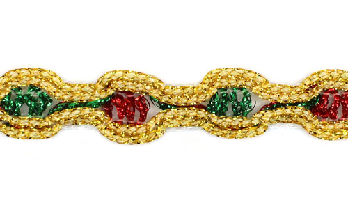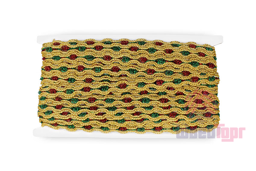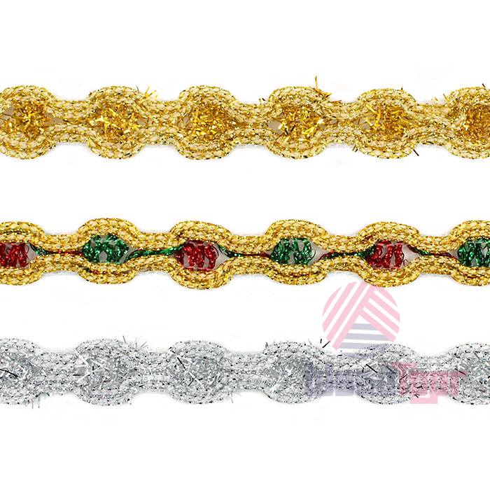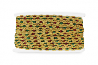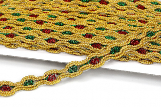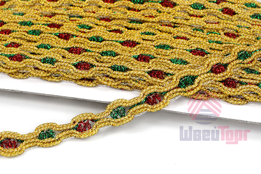 Тесьма доступна в трёх цветах: золото, серебро и золото/красный/зелёный. Она идеально подходит для отделки одежды, декора сценических костюмов, а также для украшения головных уборов и элементов интерьера. Представляет собой прочную плетёную, рельефную тесьму с повторяющимся геометрическим узором. Тесьма пронизана металлизированными нитями, что придаёт ей уникальный блеск. Создавайте свои неповторимые изделия!