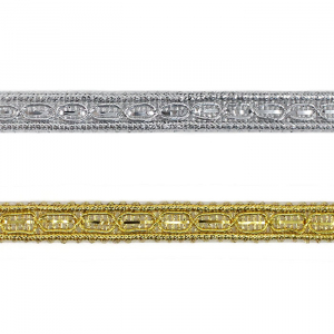 Тесьма доступна в двух цветах: золото и серебро. Она идеально подходит для отделки одежды, декора сценических костюмов, а также для украшения головных уборов и элементов интерьера. Представляет собой прочную плетёную, рельефную тесьму с повторяющимся геометрическим узором. Тесьма пронизана металлизированными нитями, что придаёт ей уникальный блеск. Создавайте свои неповторимые изделия!