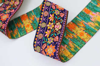 Данная жаккардовая тесьма обладает высокой прочностью, устойчива к растяжению и истиранию. Так как рисунок формируется непосредственно в процессе плетения, что придаёт тесьме эффект вышивки, тесьма сохраняет яркость цветов и не теряет своего внешнего вида долгое время. Рельефный узор тесьмы представляет собой геометрический орнамент. Благодаря высококачественному полиэстеру, из которого она изготовлена, тесьма сохраняет насыщенность цветов даже при частом использовании.
