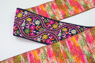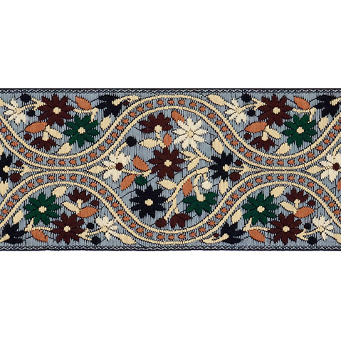Данная жаккардовая тесьма обладает высокой прочностью, устойчива к растяжению и истиранию. Так как рисунок формируется непосредственно в процессе плетения, что придаёт тесьме эффект вышивки, тесьма сохраняет яркость цветов и не теряет своего внешнего вида долгое время. Рельефный узор тесьмы представляет собой геометрический орнамент. Благодаря высококачественному полиэстеру, из которого она изготовлена, тесьма сохраняет насыщенность цветов даже при частом использовании.