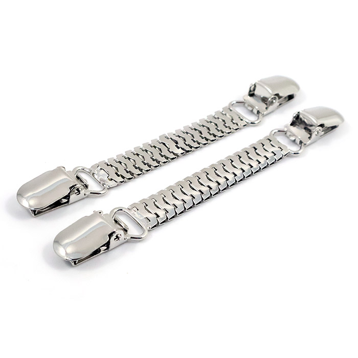 Металлическая застёжка для одежды №9088 — это практичный аксессуар, состоящий из двух зажимов-клипс, соединённых подвижной плоской цепью.